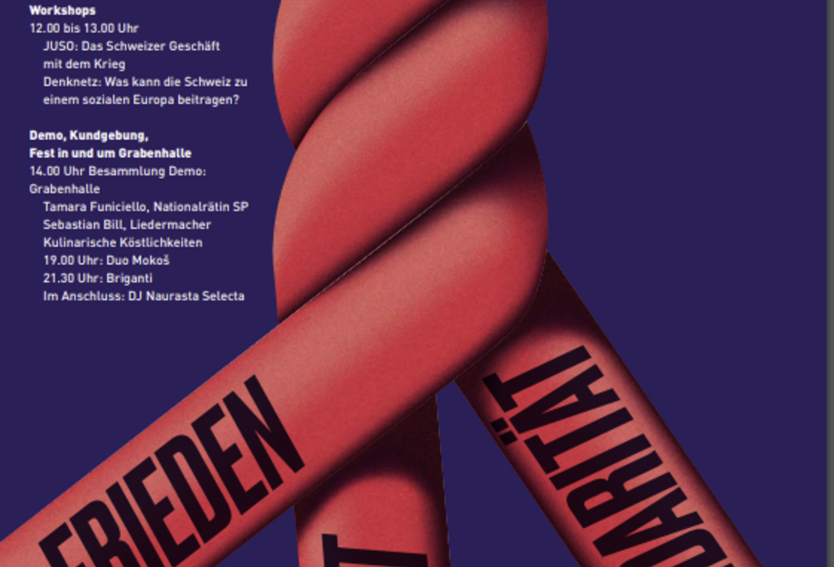 Redner:innen: Tamara Funiciello, Nationalrätin SP; Chompel Balok, Stadtparlamentarier SP; Léonie Schubiger, JUSO Kanton St. Gallen; Matthias Albold, Schauspieler, Mitinhaber Nanna Bunte Küche, Präsident SBKV; Claudia Friedl, Nationalrätin SP; Sebastian Bill, Liedermacher; Moderation: Barbara Gysi, Präsidentin Kantonaler Gewerkschaftsbund St. Gallen